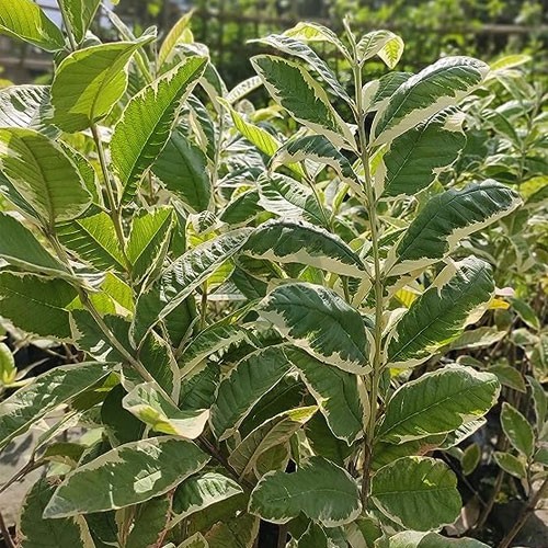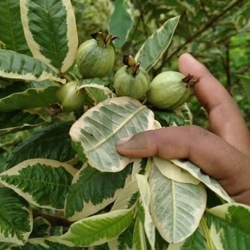 The Variegated Guava Layered Live Plant (Psidium guajava) is a stunning, high-yield tropical variety from Thailand known for both its ornamental beauty and delicious fruit. This guava tree produces round, striped fruits with a creamy-white, juicy, and aromatic interior. The fruit is sweet-tart and rich in vitamin C, perfect for fresh eating or making jams and preserves. Beyond its fruit, the Variegated Guava is admired for its striking copper-colored bark and cream-and-green variegated leaves, giving your garden a unique decorative appeal. Grown by Golden Hills Farm, this layered plant is easy to grow, resilient, and ideal for Indian climates, whether in open soil or large pots.